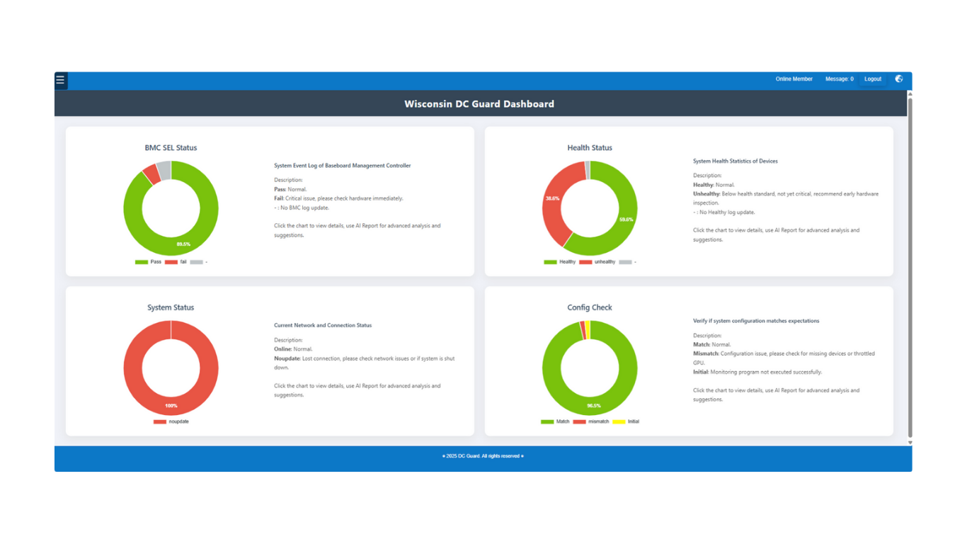 儀表板提供持續性設備健康狀況監控,讓資訊人員在每日盤點設備狀態時,能提前得知設備狀態,及時採取停機維護或更換系統硬體等措施,避免在系統真正發生異常並斷線時才發現的窘境。主動式管理持續檢測並比對CPU、記憶體、硬碟及網路等硬體的健康程度,也可以客製化監控其他硬體設備需求,如BMC網孔、風扇、RAID卡等。