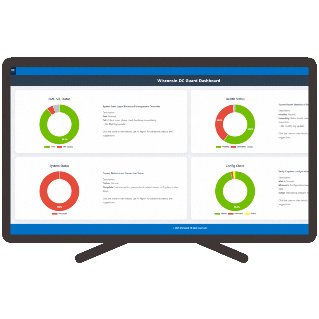 儀表板提供持續性設備健康狀況監控,讓資訊人員在每日盤點設備狀態時,能提前得知設備狀態,及時採取停機維護或更換系統硬體等措施,避免在系統真正發生異常並斷線時才發現的窘境。主動式管理持續檢測並比對CPU、記憶體、硬碟及網路等硬體的健康程度,也可以客製化監控其他硬體設備需求,如BMC網孔、風扇、RAID卡等。
